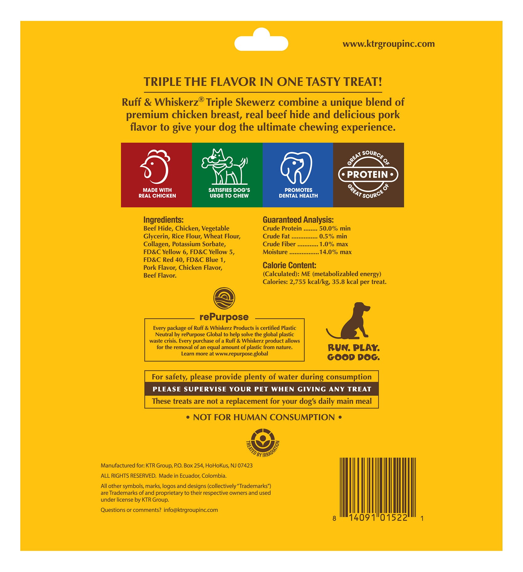 Ruff & Whiskerz Triple Kabobz will satisfy your dog's craving to chew. Premium chicken breast with real beef-hide is combined to create a unique treat that will keep your pup's tail waggin'